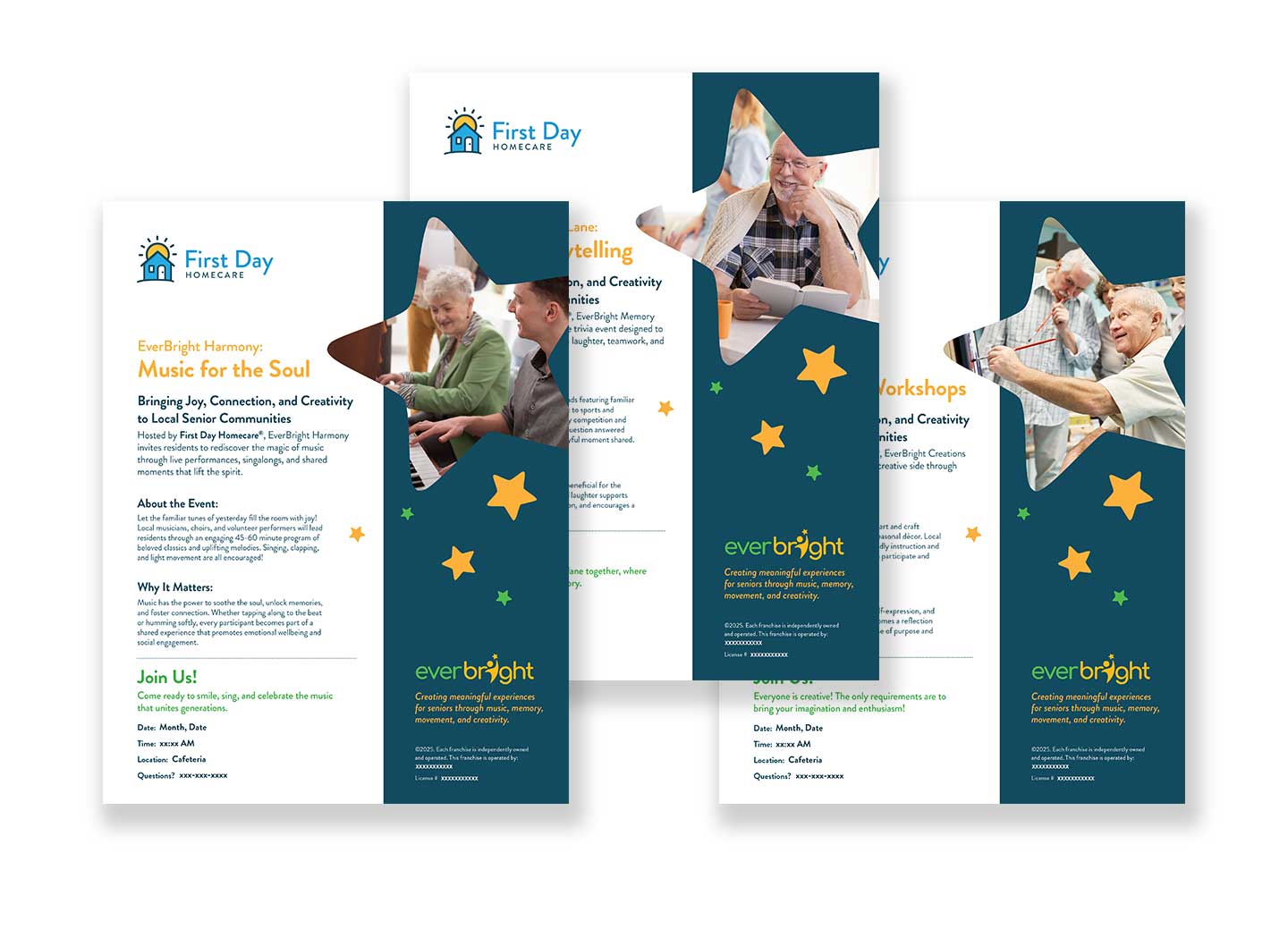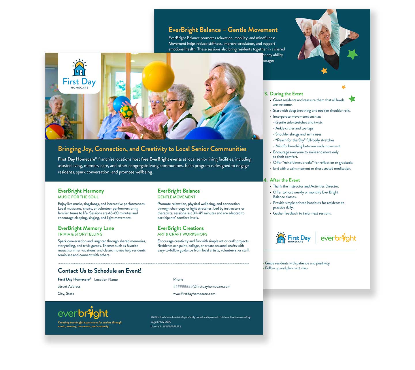 First Day Homecare partnered with Richmond Concept to develop a complete suite of branded EverBright event materials for their nationwide franchise network. The client needed a unified set of design assets that franchise owners could easily print, personalize, and use during community engagement events in senior living facilities. Richmond Concept delivered a full system that included a one page event flyer, four multi page How To Guides, and a large branded deck of EverBright Trivia Cards. All materials were built to establish a consistent visual identity for the EverBright program and support a scalable, high quality experience across all franchise locations.