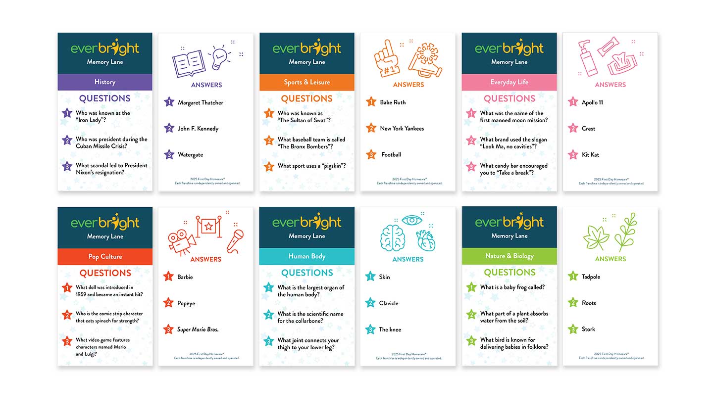We used Adobe Illustrator and InDesign to build a structured design framework that allowed every asset to share a unified visual language. The layouts applied the EverBright color palette, modular typography styles, and consistent content blocks so the system could grow as new programs are added. Each PDF was designed with editable form fields, allowing First Day franchise owners to enter their own contact information and enabling senior facilities to input specific event dates and times without altering the underlying design. For the trivia cards, we developed a color coded category system inspired by classic card games and optimized all type sizes for seniors and low vision users. The files were built with high contrast elements, clear alignment rules, and production ready formatting that supports both single sided and double sided printing.