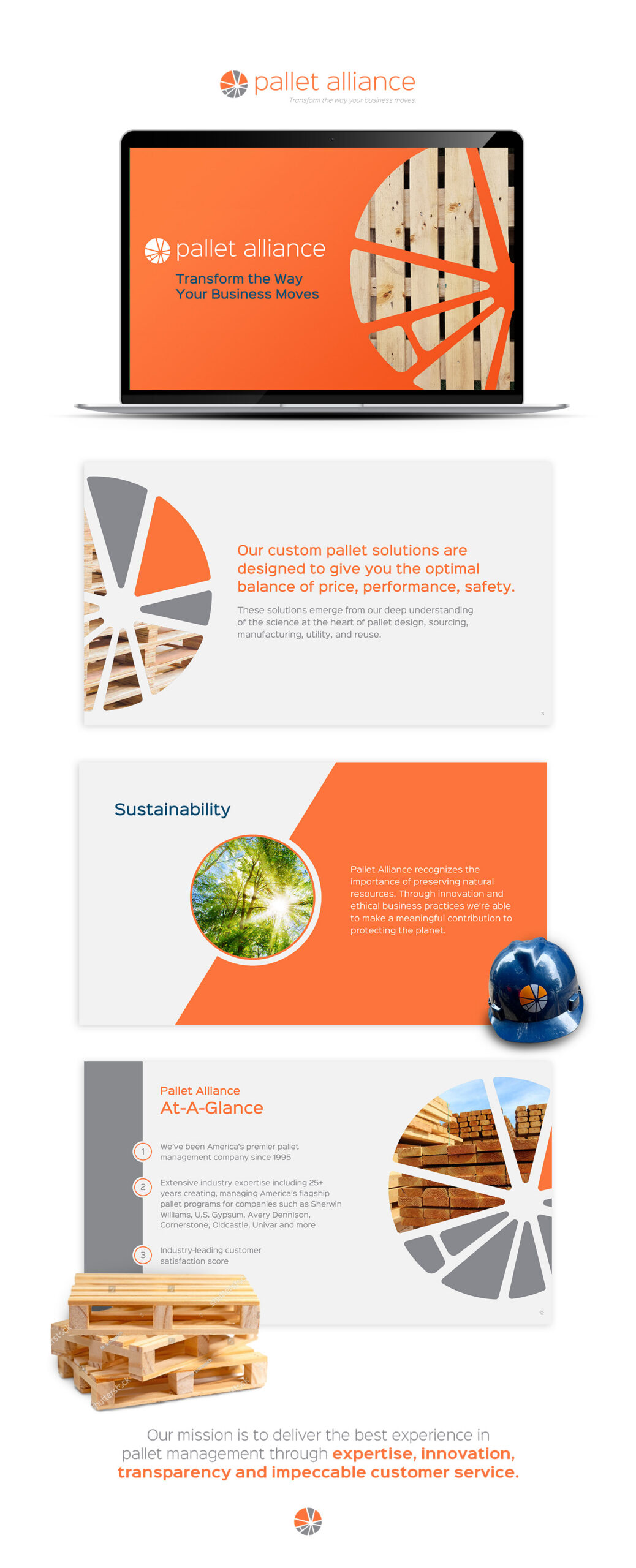 The primary goal was to design a clear, modern presentation that simplifies complex operational concepts while positioning Pallet Alliance as a strategic partner. We focused on improving content hierarchy, visual clarity, and storytelling so the deck could be sent without a live presenter. Success was defined by a presentation that feels cohesive, easy to follow, and strong enough to communicate value independently.